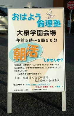 「おはよう倫理塾」とは家庭倫理の会が日本全国で早朝に開催する生涯学習講座です。 家庭倫理の会練馬区では中村橋、大泉学園、板橋区双葉町の3ヶ所で、早朝5時30分〜6時20分に開催しています。 純粋倫理を学び、わがままを捨てて純情(すなお)な人間になり、さまざまな問題を解決して人生を好転させる倫理実践者の育成を目指しています。 会場の案内&地図